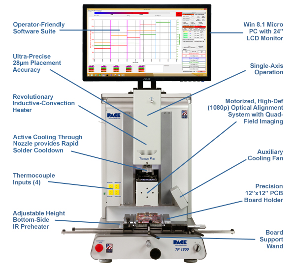 Enter PACE’s TF 1800 BGA/SMD Rework System. With its groundbreaking, patent-pending Inductive-Convection Heating Technology, the TF 1800’s top-side heater reaches the target temperature in just seconds for safe, rapid solder joint reflow in virtually any component installation or removal application.